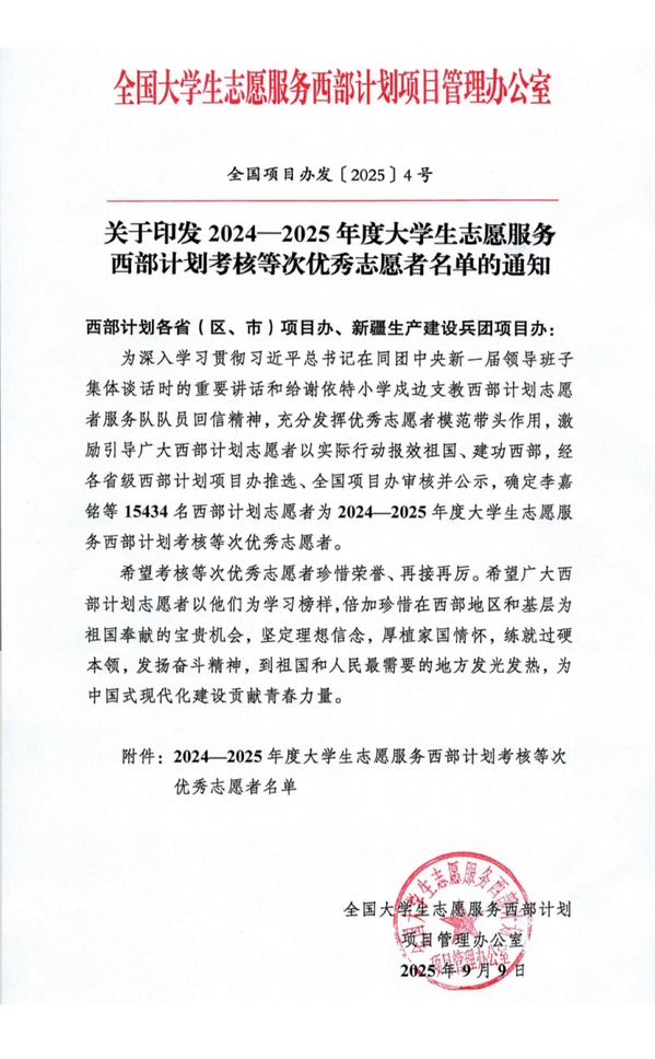 近日,全国老员工志愿服务西部计划项目管理办公室发布2024-2025年度老员工志愿服务西部计划考核等次优秀志愿者名单,公司3名西部计划志愿者获评全国西部计划考核等次优秀!