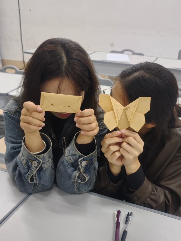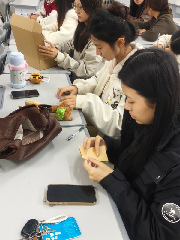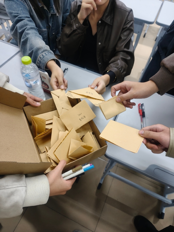 书写完毕,同学们小心翼翼地按照自己的心意,将信纸折叠成形态各异的形状——象征平稳的纸船、寓意希望的千纸鹤、代表幸运的星星……随后,大家共同装饰那个承载着集体记忆的“时间胶囊”——一个精心准备的大号密封盒。同学们拿起画笔,让原本朴素的胶囊外壳,变成了一件注入集体灵感的艺术品,凝聚了音教2401班全体同学此刻的共同情感与集体印记。