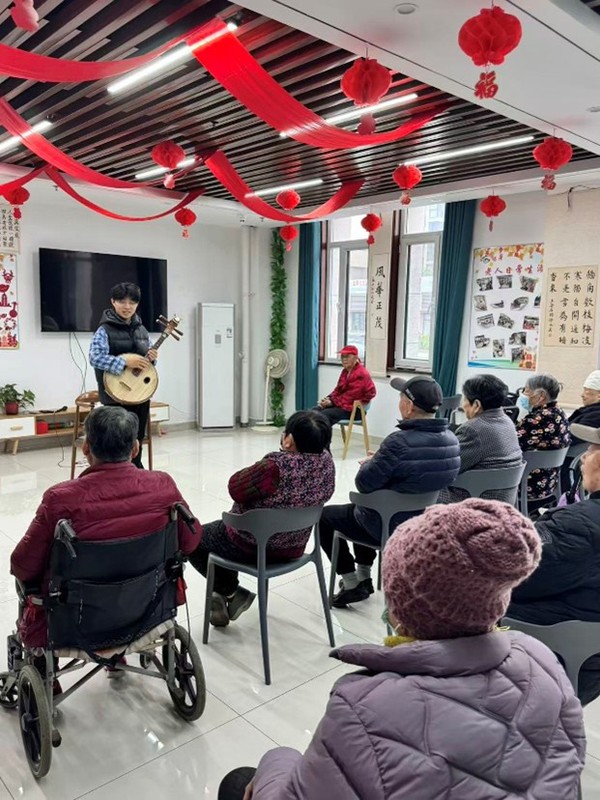器乐演奏的同学则用中阮演奏了《云南回忆》。婉转的音符如流水般淌过心田,展现了音乐的韵味,也让长者们感受到了艺术的宁静与力量。
