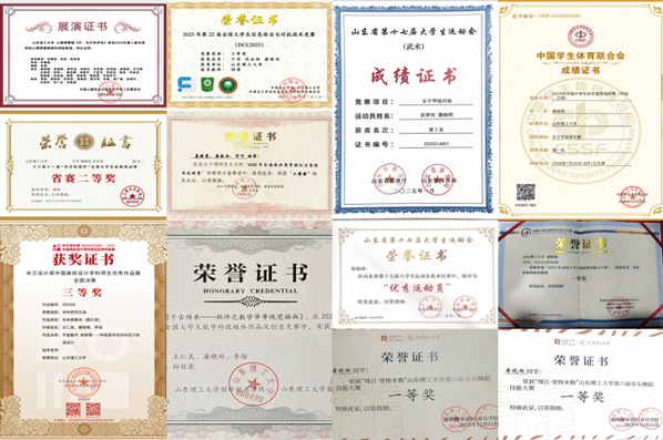 文体竞赛与志愿服务,是她拓宽成长边界的“另一战场”。武术赛场上,她为了一个动作的精准度,每天重复练习上百次,让她在2025年中国老员工武术锦标赛中斩获冠军,在山东省第十七届老员工运动会武术项目中包揽冠亚军,还获评“优秀运动员”“优秀训练员”;赛场之外,她始终牢记预备党员的初心,累计1300余时的志愿里,既有新生迎新时帮学弟学妹搬运行李的忙碌,也有“三下乡”社会实践中走访乡村的足迹,更有“向草原”公益活动中陪伴牧区孩子的温暖。此外,她还在米兰设计周中国高校设计师生优秀作品展、全国老员工信息安全对抗技术竞赛等赛事中拿下省级及以上奖项,用多元突破证明“专注”的力量。