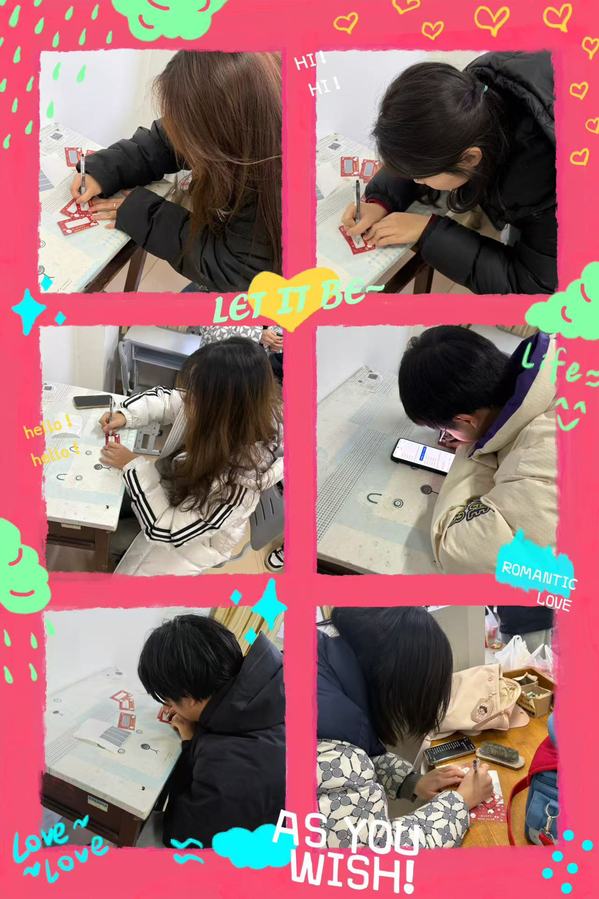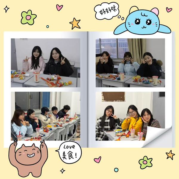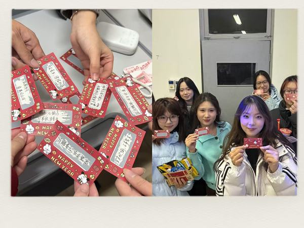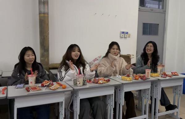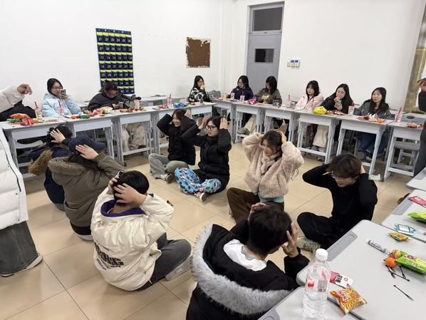 活动开始前,班委们早早来到教室,化身“后勤小分队”忙碌不停。大家齐心协力布置场地,缤纷的彩带将教室装点得焕然一新;精心准备的零食饮料整齐摆放,更暖心的是,班委们还为每位同学手写了新年祝福语,字里行间满是温暖的期许。
